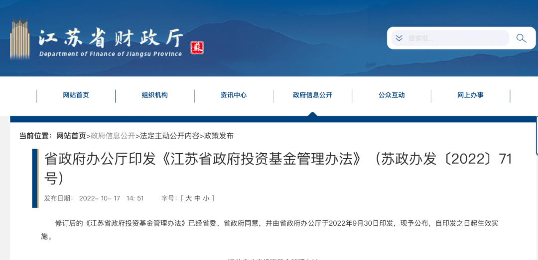 江苏省政府办公厅印发《江苏省政府投资基金管理办法》(苏政办发〔2022〕71号)