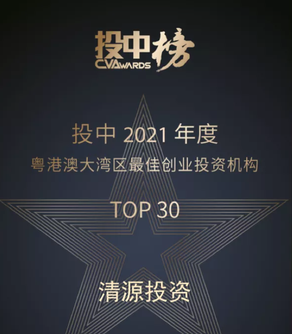 清源投资荣获投中“2021年度粤港澳大湾区最佳创业投资机构TOP30”奖项