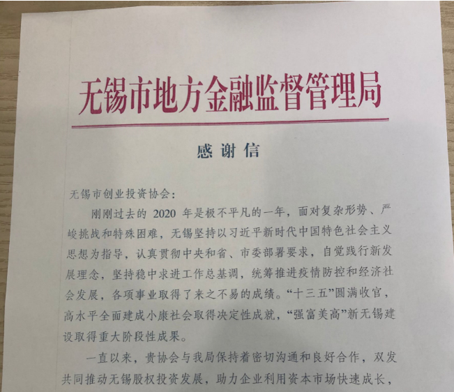 无锡市创业投资协会收到无锡市地方金融监督管理局发来的感谢信