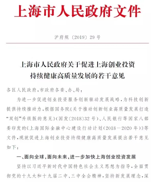 上海市政府发布《关于促进创业投资持续健康高质量发展的若干意见》