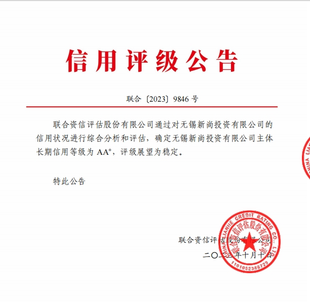 协会理事单位太湖新城集团新尚资本荣升AA+信用等级